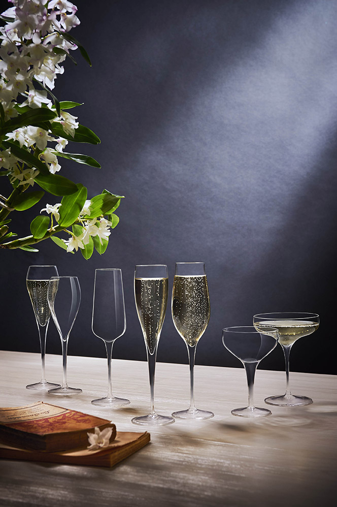 Le flûte e i calici più indicati per i brindisi natalizi fanno parte delle collezioni Super, Atelier, Intenso, Vinoteque, Vinea e Michelangelo.