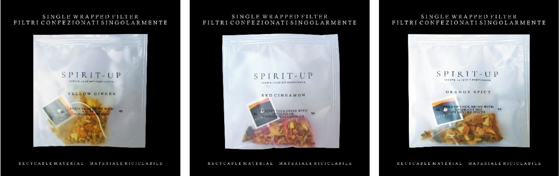 Queste miscele di spezie, vengono confezionate in filtri piramidali biodegradabili e compostabili, che rispettano l’ambiente e possono essere gettati nell’umido (a parte il tag che va nella carta). La produzione di questi filtri viene fatta utilizzando una tecnologia innovativa inventata in Giappone, che permette di saldare i medesimi attraverso gli ultrasuoni, e quindi senza aggiunta di collanti. Il talloncino, anche detto tag, di ogni filtro piramidale, viene personalizzato con il marchio Spirit-Up. Per i filtri è stata scelta una grammatura superiore alla media, ovvero pari a 3 grammi di peso netto. Il taglio delle spezie, ottimizzato per l’infusione, e la grammatura scelta, fanno sì che le miscele esprimano al meglio i loro sentori già dopo pochi minuti, anche a freddo.