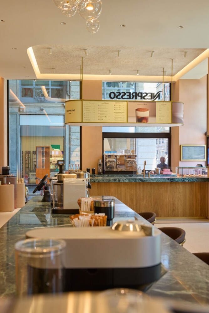 Il design dello spazio, elegante e contemporaneo, richiama Milano con dettagli in marmo italiano e un bassorilievo realizzato a mano, mentre le vetrine su Piazza Cordusio incorniciano tre aree principali: degustazione, personalizzazione e vendita di macchine, capsule e accessori. Collaborazioni artistiche come quelle con Francesco Poroli e Caffè Florian contribuiscono a rendere l’esperienza immersiva, combinando arte, design e cultura del caffè.