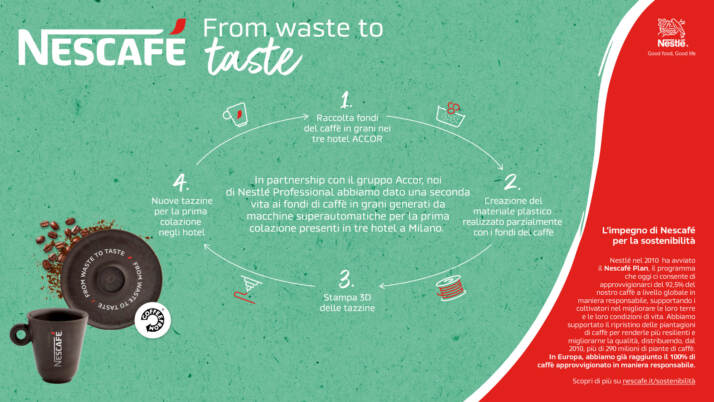 Grazie al supporto di Coffeefrom, startup innovativa e attiva nel settore della bioeconomia, Nestlé Professional si è impegna a raccogliere i fondi di caffè generati direttamente dalle macchine Nescafé in grani di tre diversi Hotel del gruppo Accor nell’area di Milano. Da qui, Coffeefrom si è occupata di creare un compound di caffè e materiali plastici, utilizzato come materia prima per la creazione di tazzine di design personalizzate, dando quindi una seconda vita al caffè esausto, altrimenti destinato a diventare rifiuto.