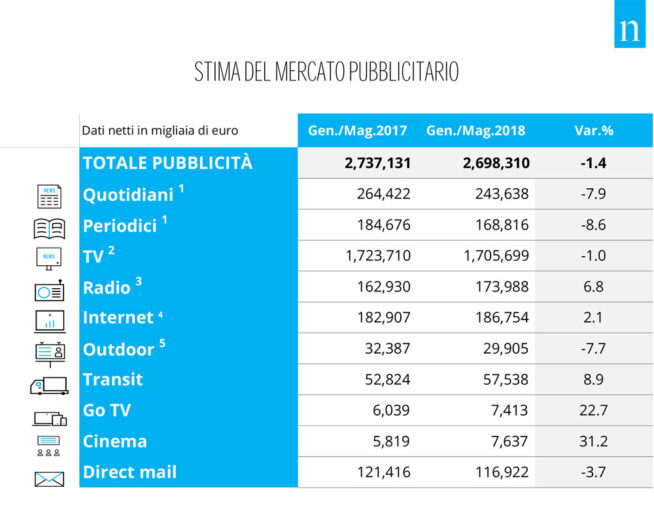 Il mercato degli investimenti pubblicitari in Italia chiude il mese di maggio in negativo, a -1,8% (-4,9% senza search e social), portando i primi 5 mesi del 2018 a +0,9% rispetto allo stesso periodo del 2017. Se si esclude dalla raccolta web la stima Nielsen sul search e sul social, l’andamento dei primi 5 mesi registra un calo del -1,4%.