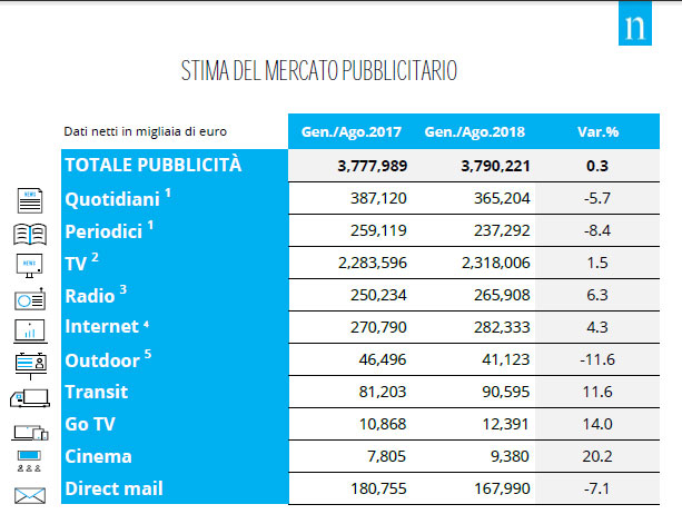 Relativamente ai singoli mezzi, la TV cresce ad agosto del +4,4% e chiude i primi otto mesi del 2018 a +1,5%. Lieve segno negativo per i quotidiani, che nel singolo mese calano del -0,9%, consolidando il periodo cumulato a -5,7%. Andamento negativo per i periodici, sia ad agosto che nei primi otto mesi, con cali rispettivamente del -3,5% e del -8,4%. Dopo la parentesi negativa di luglio (finora unico mese negativo dell’anno), torna a crescere la radio grazie a un’ottima raccolta: l’importante incremento di agosto (+18,2%) conferma la crescita anche per il periodo cumulato (+6,3%).