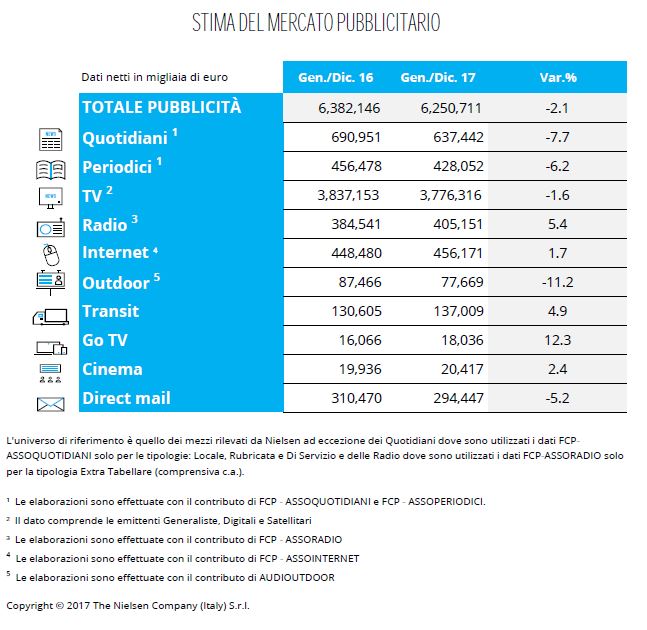 Relativamente ai singoli mezzi, la tv chiude il 2017 in calo dell’1,6%. Positivo (4,8%) il mese di dicembre.