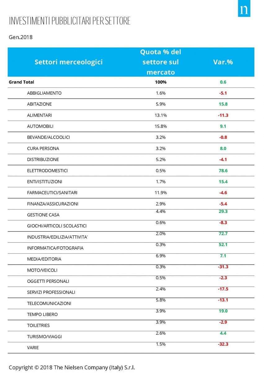 “Dal punto di vista del mercato, il 2018 è iniziato sotto buoni auspici” – spiega Alberto Dal Sasso, AIS Managing Director di Nielsen. “Tra le variabili considerate, anche il risultato elettorale, ben chiaro nei numeri ma quanto mai incerto sulla formazione di un Governo, non ci consente di sbilanciarci su una previsione per il resto dell’anno, tenendo presente inoltre che il mese di gennaio non è rappresentativo del trend per i prossimi mesi. La crescita economica consolidata, seppur debole, e un equilibrio politico europeo in fase di cambiamento rendono complessa l’interpretazione dello scenario da più punti di vista, compreso quello degli investimenti pubblicitari da parte di grandi e piccole aziende”.