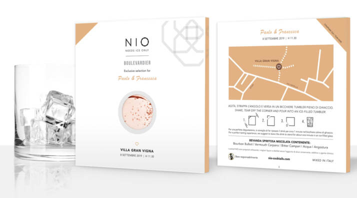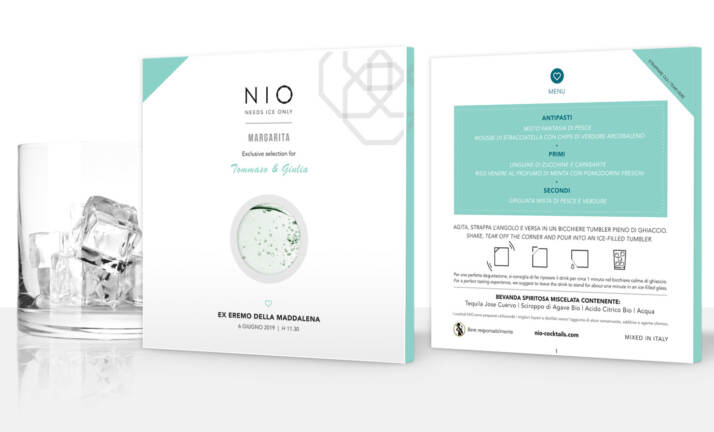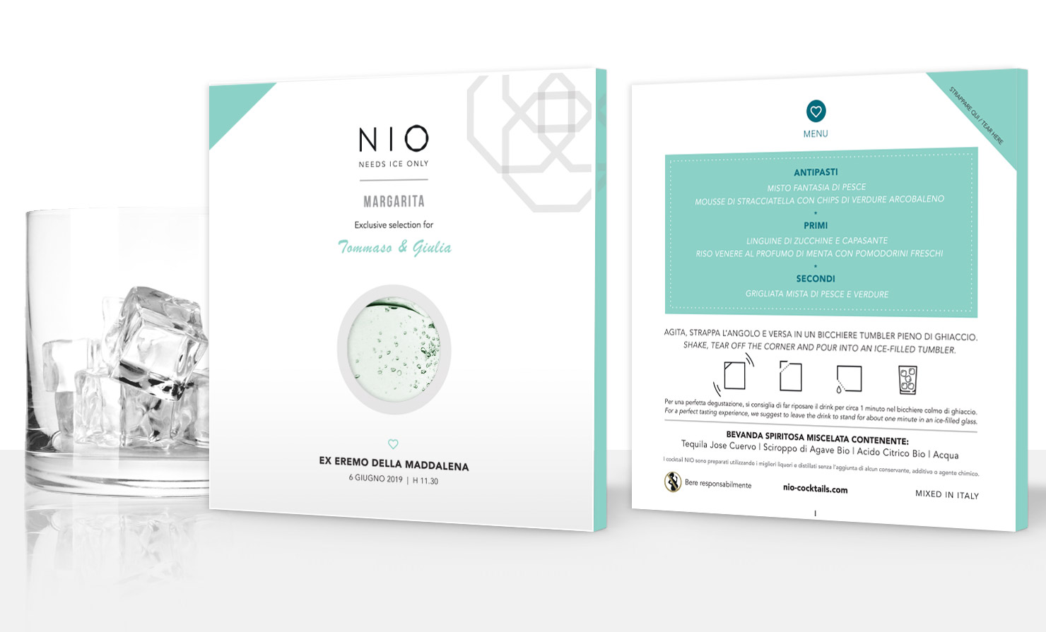 NIO sta per Needs Ice Only e rappresenta l’innovazione in questo settore. Basta aprire il pack e aggiungere ghiaccio e i cocktail delle drink list più conosciute sono subito a disposizione. Tutti i cocktail si presentano esternamente in un’elegante confezione (chiamata skin) in cartoncino, a forma di CD. Il formato innovativo, essenziale ed elegante, è ideale per essere personalizzato con le grafiche del matrimonio, diventando anche un perfetto invito o una bomboniera affinché il brindisi beneaugurale alla coppia continui anche dopo i festeggiamenti.