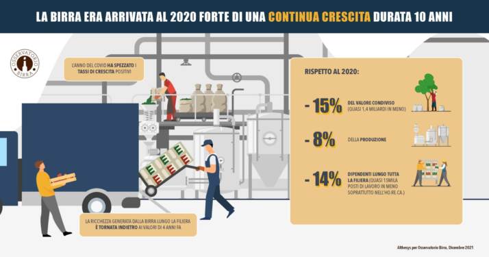 I dati, che fotografano l’andamento del settore nel 2020 e nei primi 6 mesi del 2021, evidenziano l’impatto del Covid-19 e la lenta ripresa dell’anno in corso. La “gelata” dell’anno scorso (-15% del Valore condiviso, -8% della produzione di birra, -9,6% dell’occupazione) ha fatto perdere alla birra quasi 1,4 miliardi di euro e circa 15mila posti di lavoro (14.634) lungo l’intera filiera, soprattutto nell’Ho.Re.Ca., riportando il “peso” della birra ai livelli di 4-5 anni fa. I primi sei mesi del 2021 evidenziano una ripresa rispetto allo stesso periodo dell’anno precedente, ma non sono sufficienti a colmare il crollo (-22%) di gennaio-giugno 2020. È vero che nell’anno in corso sono stati recuperati 635 milioni di euro, ma, se allarghiamo il confronto con il primo semestre 2019, mancano all’appello ancora 249,2 milioni di euro.