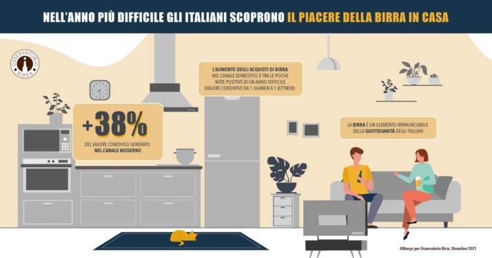 In questo anno e mezzo difficile non è però venuta meno la voglia di birra degli italiani: l’aumento degli acquisti di birra nella GDO (da 1.364 mln a 1.877 il valore condiviso del canale domestico) è tra le poche note positive di un anno difficile, per magnitudo (+38%), ma anche per quello che rappresenta E sembra che le nuove occasioni di consumo domestiche abbiano aperto alla birra una nuova dimensione, che va oltre l’isolamento forzato e le chiusure dei luoghi del fuori casa dei mesi scorsi.