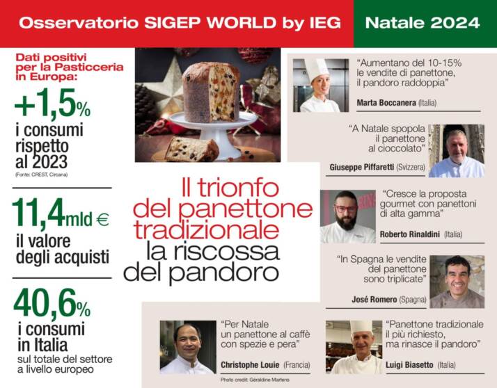 I consumi e i trend del mondo della pasticceria in vista del Natale tornano come ogni anno sotto la lente dell’Osservatorio Sigep, il salone internazionale di Gelateria, Pasticceria, Panificazione, Caffè – e da quest’anno anche della Pizza – di IEG – Italian Exhibition Group (Fiera di Rimini, 18-22 gennaio 2025, sigep.it).