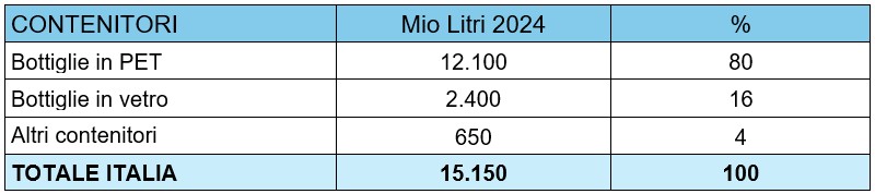 Il formato da 1,5 litri rappresenta oltre due terzi dei volumi PET, mentre quello da 2 litri si è particolarmente diffuso nelle regioni meridionali e insulari.