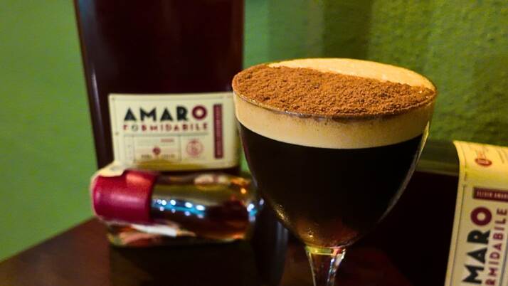 Preparazione: aggiungere Amaro Formidabile, il caffè, il Drambuie e lo zucchero all’interno di uno shaker con abbondante ghiaccio. Agitare con vigore e filtrare tutto con l’aiuto di uno strainer e versare in una coppetta. Guarnire con garnish di cacao amaro.