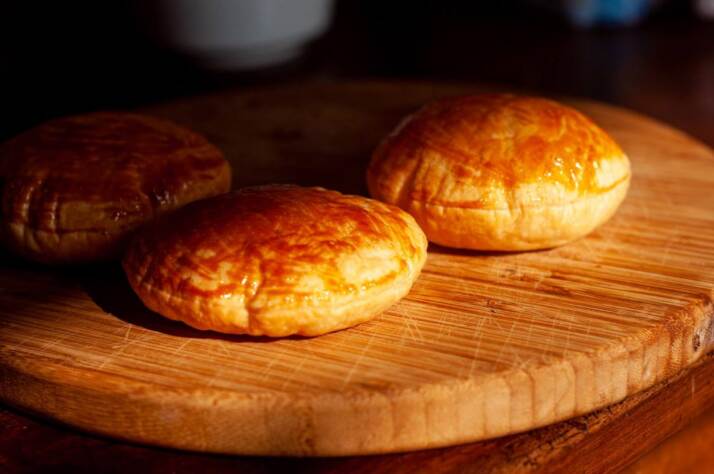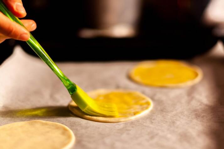 Disporre quindi i dischi di pasta sfoglia ottenuti su una leccarda ricoperta di carta forno, spennellarne la superficie con del rosso d’uovo aiutandosi con un pennellino e infornare a 180° fino a doratura.