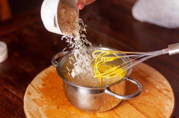 Mentre i dischi di pasta sfoglia cuociono in forno, preparare la crema all’uovo per i nostri panini salati al caffè: fare sciogliere il burro, aggiungere la farina e gradualmente il latte. Insaporire con curcuma e cuocere fino ad addensare.