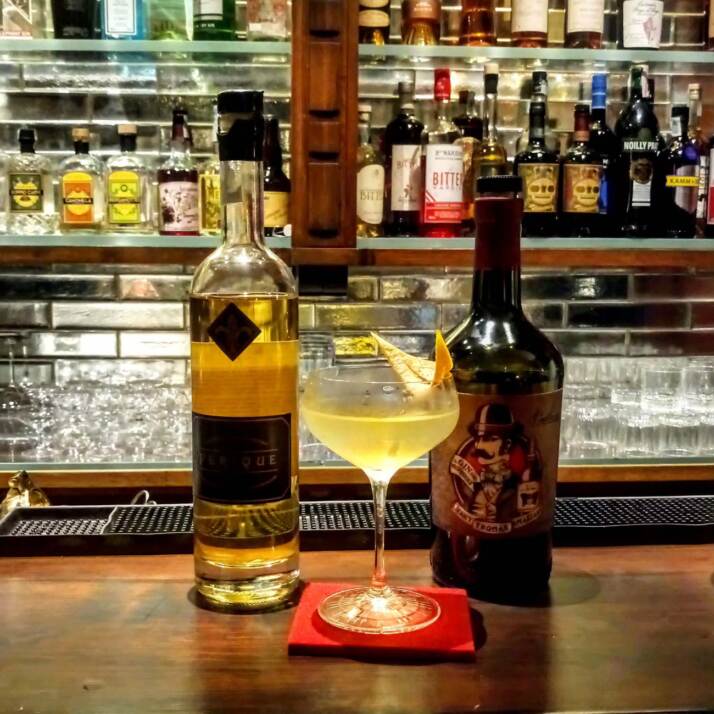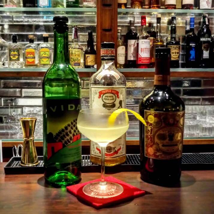 A me piacciono molto i gusti decisi, con carattere. L’Estate provo a non rinunciarci, proponendo ad esempio Cocktail a base Mezcal, un distillato che trovo stupendo! Un esempio e una mia creazione con il già citato Mezcal come base, vermouth bianco del professore, un triple sec pierre ferrand e succo di limone. Un cocktail fresco, con una nota aspra, che non rinuncia ad avere un’identità.