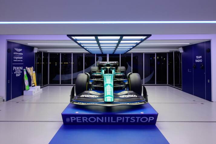 Si tratta di uno spazio di intrattenimento dove poter avere una brand experience unica nel suo genere e che ha già fatto parlare di sé in diverse città europee: qui si sarà trasportati nell’esperienza del garage Aston Martin F1™️ Team vissuta attraverso tutti e 5 i sensi e in maniera totalmente immersiva. Grazie a Peroni Nastro Azzurro 0,0%, gli ospiti potranno vedere da vicino la perfetta riproduzione dell’auto da corsa AMR22 e toccare con mano di persona tutta la passione che si respira in un garage di F1. I suoni, gli odori, i gesti e le immagini tipici di un box a bordo pista saranno i protagonisti di questo spazio dove tutti sono invitati a vivere appieno ogni momento… grazie al gusto unico, rinfrescante, italiano di Peroni Nastro Azzurro 0,0%.