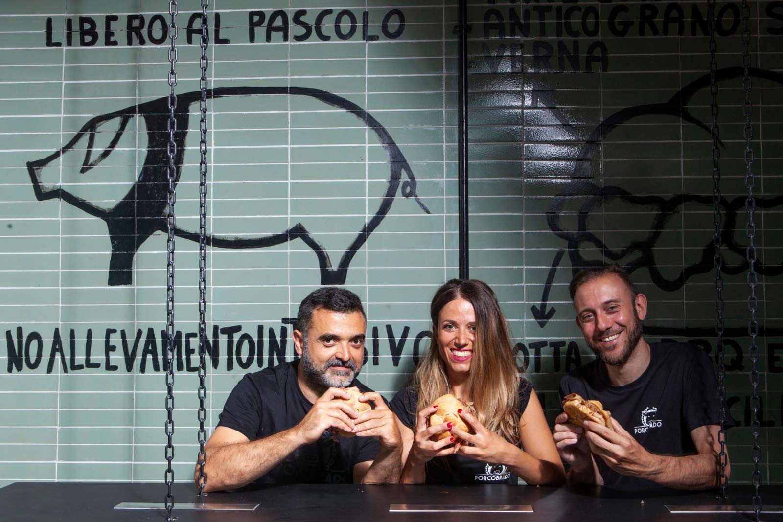 Angelo Polezzi, titolare dell’Azienda Agricola Borgonovo di Cortona, ha iniziato il viaggio di Porcobrado a bordo di un foodtruck, facendo diventare famoso il panino in Italia e non solo. In tanti l’hanno provato nonostante le code chilometriche, ma due ragazzi hanno talmente apprezzato il panino da farlo sbarcare a Milano dentro in un locale vero e proprio. Laura Stano e Pasquale Nastri si sono innamorati al primo morso e hanno slacciato le cinture gettandosi anima a corpo in questo progetto, che si appresta a diventare il primo di un format destinato a ingrandirsi. “Siamo partiti con tanta voglia di far conoscere questo prodotto unico, a Milano c’è molta fame di Toscana ma questo panino di Cinta Senese è davvero unico e ce ne rendiamo conto dallo stupore che prova chi lo assaggia per la prima volta, è talmente leggero da sciogliersi in bocca grazi anche a un pane speciale”. La materia prima arriva direttamente dalla casa madre ogni settimana, la carne dei maiali di Cinta Senese che crescono allo stato brado nelle colline della Toscana. Ma che cosa rende speciale questo panino? “Ciascun boccone è un’esplosione di gusto in bocca il pane è fatto con un grano antico mentre la ciccia è l’unica DOP in tutta Europa con tanto di disciplinare da rispettare”.
