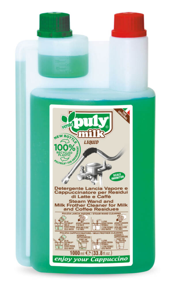 Sotto i riflettori i nuovi flaconi 100% R-PET, 100% plastica riciclata e riciclabile, di pulyMILK Plus® e pulyMILK Verde Power®, le due versioni del detergente che elimina l’accumulo delle proteine dentro e fuori la lancia vapore ed è ideale per la manutenzione quotidiana delle lance dei cappuccinatori automatici.