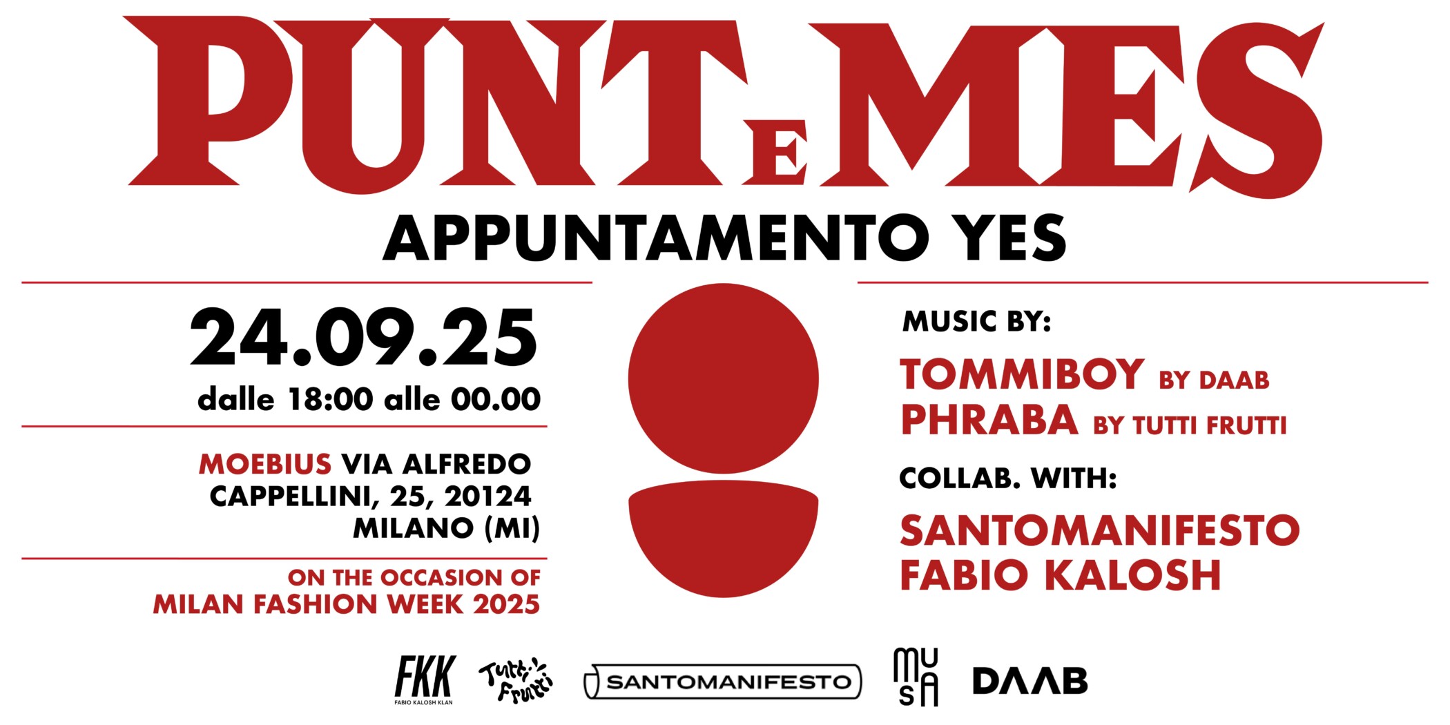 Durante l’evento saranno disponibili in esclusiva e in omaggio t-shirt con grafica di Fabio Kalosh prodotte da Unnatural e i poster artistici firmati Santomanifesto, entrambi dedicati a Punt e Mes in occasione della Fashion Week 2025.
