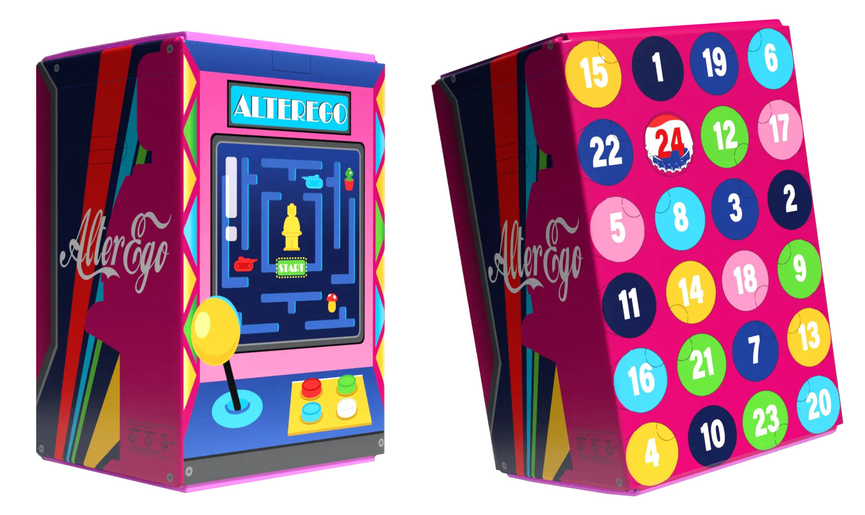 Il design richiama l’immaginario arcade: cabinet magenta, pulsanti colorati, grafica anni ’80 e l’inconfondibile stile “Alter Ego”, elemento centrale dell’opera di Ale Piano. Anche in questo caso, il contenuto prevede 24 craft beer provenienti da diversi paesi, selezionate per accompagnare il mese di dicembre con stili e interpretazioni aromatiche differenti.