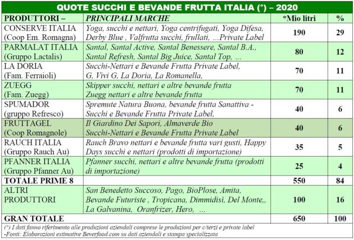 Con riguardo al settore succhi e bevande frutta le aziende che producono e/o distribuiscono questi prodotti in Italia sono una cinquantina, ma la leadership del mercato a quantità appartiene alle private labels con una quota intorno al 40% del totale vendite della distribuzione moderna (oltre il 40% nella GDO e addirittura oltre il 70% nei discount).