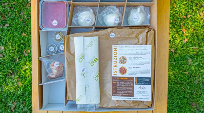 Come funziona? Elaborato dal pizzaiolo di “Duje” in persona, Michele Leo, il kit comprende quattro dischi già cotti e tutti gli ingredienti necessari per realizzare sia la “Margherita” che la “Napoli”, da condire con una serie di materie prime scelte tra quelle usate nel locale di Largo Annigoni e quelle selezionate insieme a produttori locali (basti pensare alla salsiccia di Grigio del Casentino di Fabio Picchi del vicino “Cibreo”). Disponibile anche nella versione senza glutine, questo “Kit Pizza” consente inoltre di mantenere la pizza in frigo per qualche giorno e di finirla con un rapido passaggio in forno: tra il topping e la cottura, in una decina di minuti al massimo si riesce infatti a gustare una pizza praticamente identica a quella appena uscita dal forno a legna.