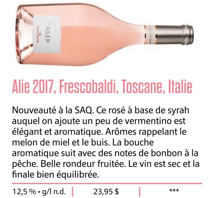 Si tratta di Alìe, vino di Frescobaldi, che prende il nome dalla ninfa legata al mare, simbolo di sensualità e bellezza. Alìe, un elegante Rosé dal colore chiaro, puro, con tenui riflessi rubino è un raffinato equilibrio tra Syrah e Vermentino, che trovano nella vicinanza con il mare la loro massima espressione.