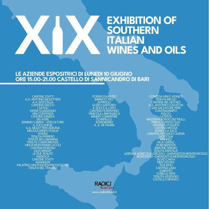 Radici del Sud è un evento a cura di Propapillatourism wine&food, quest’anno organizzato in collaborazione con Assoenologi (Organizzazione nazionale di categoria dei tecnici del settore vitivinicolo), AEPI (Associazione Enotecari Professionisti Italiani), Vinarius (Associazione Enoteche italiane) e AIS Puglia (Associazione Italiana Sommelier Puglia), con il patrocinio di Comune di Sannicandro di Bari e Regione Puglia.