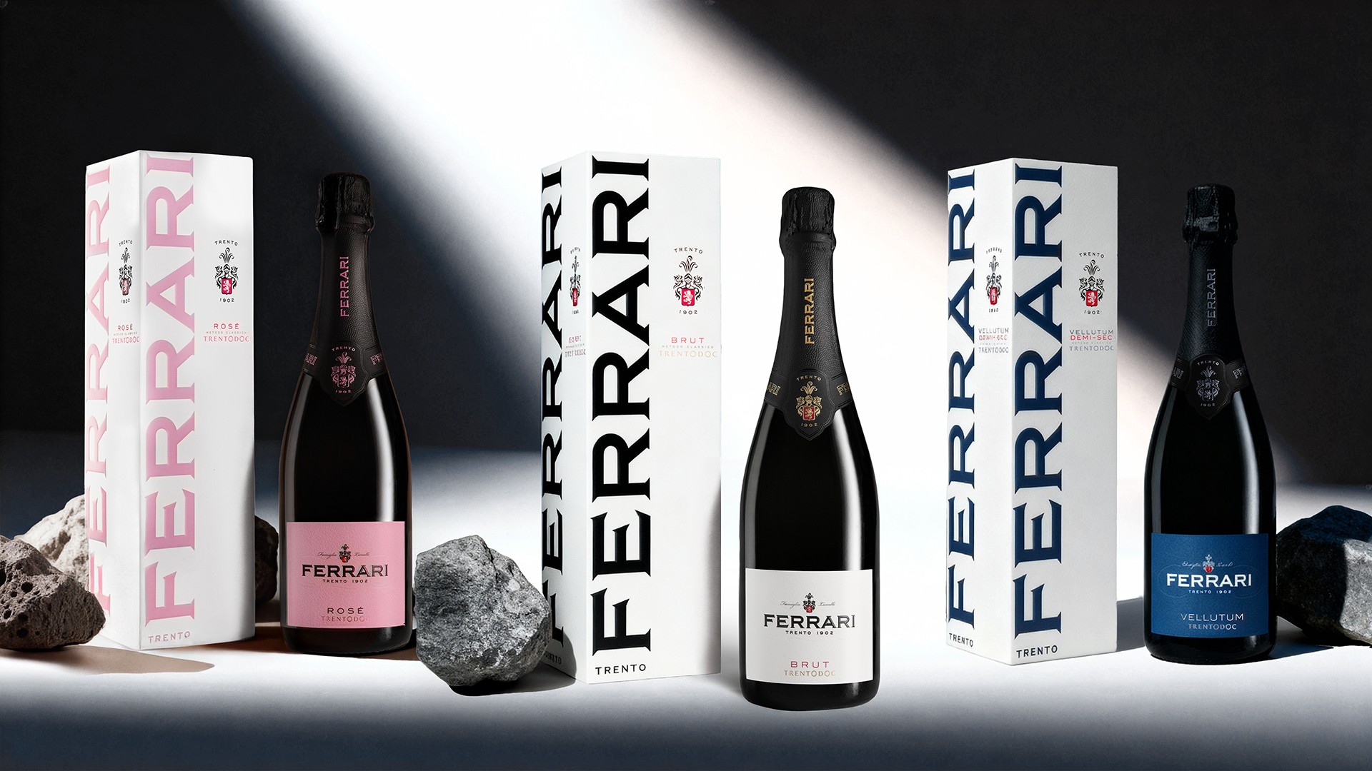 Il Ferrari Brut resta fedele al bianco e nero che sono i colori distintivi della cantina fin dai tempi di Giulio Ferrari. Per il Ferrari Rosé e il Demi-Sec invece cambio di colore, il Rosé adotta una nuova tonalità di rosa, mentre il cambiamento è più significativo per il Demi-Sec, con un’elegante etichetta blu scuro e con un nuovo nome in etichetta, Vellutum. Un naming per evocare la morbidezza avvolgente di una bollicina ideale per accompagnare i dessert. Anche gli astucci dell’intera linea sono stati ripensati, con un design che rafforza la visibilità del marchio Ferrari e integra, su uno dei quattro lati, un elemento narrativo che racconta il vino.