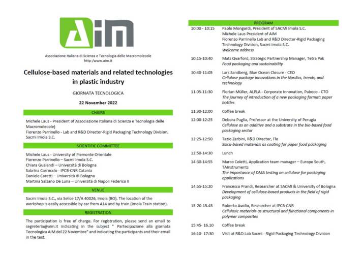 From pioneering research to applied technology, building the development prospects of an entire industry: cellulose-based materials for rigid sustainable packaging is a hot topic, and will be the focus of the Technological Day organized by AIM (Italian Association of Science and Macromolecule Technology), scheduled for 22nd November 2022.