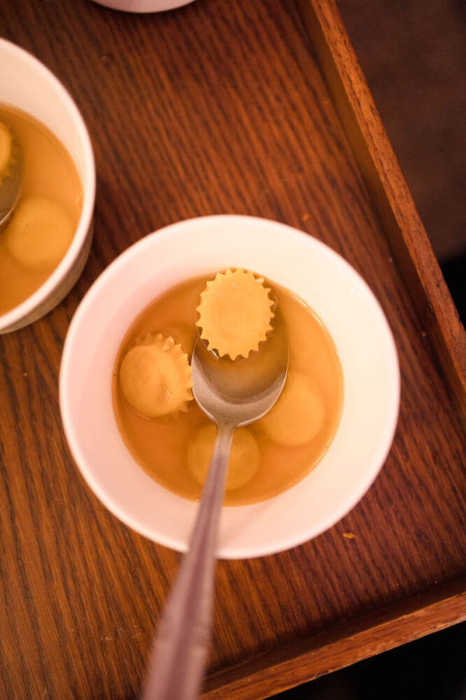 Il nuovo menu de L’Alchimia ripercorre la storia del ristorante con piatti che sono diventati iconici per gli ospiti. Il percorso gastronomico inizia con una ricciola cruda con culatello Boschi Fratelli e crema di arachidi, seguito dai tagliolini fatti a mano con salsa marinara e ragù di crostacei, un rombo poché con spuma di funghi, foie gras e limone salato, e un coniglio grigio di Carmagnola alla Wellington con salsa rubra e polvere di peperone crusco. Il gran finale è un dessert dal nome evocativo: Luna, una sfera di mousse al cioccolato caramelia con cuore di frutti esotici, guacamole dolce di avocado e latte di cocco. Oltre al menu degustazione, sono disponibili alcuni piatti che celebrano la tradizione milanese, come il risotto allo zafferano (una ricetta che risale al 1574), la cotoletta impanata e il bollito misto. L’offerta gastronomica si arricchisce anche di piatti provenienti da altre regioni italiane, come i tagliolini 36 uova piemontesi con burro di malga e tartufo bianco d’Alba, il pandoro veronese servito con crema mantecata, e la pasta mista con crema di fagiolina del Trasimeno e cozze Mitilla di Pellestrina. Ogni piatto racconta la storia di piccoli produttori italiani, e nel menu sono riportati i loro nomi, a sottolineare l’eccellenza delle materie prime selezionate.