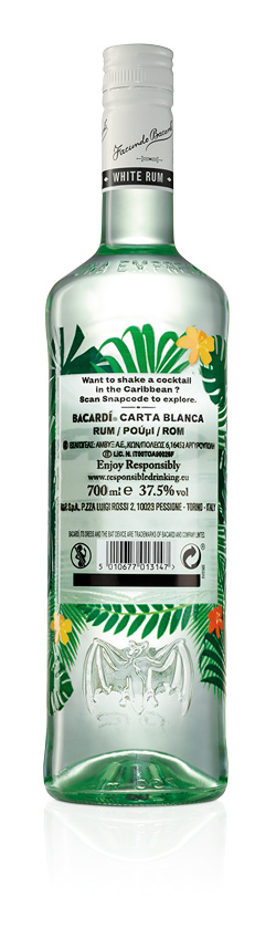Lo spirito caraibico del marchio è il cuore della promozione, a partire dal design grafico della bottiglia. Sullo scaffale, la bottiglia si distingue per la deliziosa stampa a colori a 360 ° con raffigurazioni di foglie di palma e fiori tropicali. Attraverso l’applicazione selettiva di elementi di design, realizzati con O-I: EXPRESSIONS RELIEF, è stato aggiunto un effetto tattile al motivo del pipistrello BACARDÍ e al nome del marchio, insieme a una selezione di foglie e fiori. Si può dare il via a un’innovativa esperienza di Realtà Aumentata (AR) grazie a una lente Snapchat e allo Snapcode sulla bottiglia. Questa è la prima volta che il marchio presenta l’esclusivo Snapcode sulla bottiglia di rum Carta Blanca che verrà lanciata su cinque mercati nel 2020.