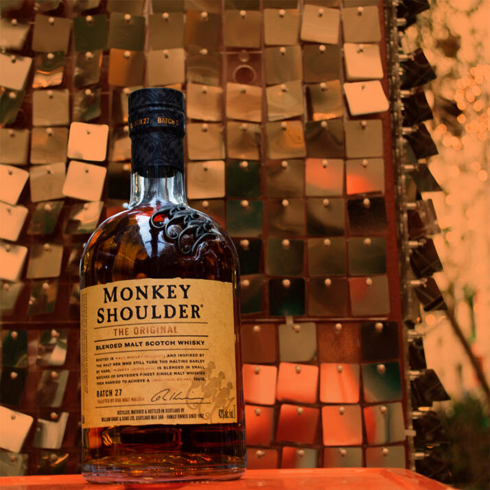 Monkey Shoulder è un whisky della famiglia William Grant & Sons, nato con la volontà di creare un whisky moderno e rivoluzionario nel mondo della mixology. Il nome Monkey Shoulder – ovvero “spalla da scimmia” – è riferito alla condizione fisica a cui molto spesso i malt men andavano incontro dopo anni di intenso lavoro nel rivoltare a mano i cumuli di orzo in fase di germinazione. Questo procurava loro una deformazione all’arto che impugnava la vanga, facendolo pendere verso il basso, come nella postura di una scimmia. Monkey Shoulder è l’unico whisky realizzato con malto al 100% combinando tre Speyside single malt, tutti provenienti da una produzione small batch, assemblando lotti di barili relativamente piccoli. Basato unicamente su un triplo blend di malti maturati in barili ex bourbon provenienti dalle tre distillerie di Dufftown di proprietà della William Grant & Sons – Glenfiddich, Balvenie e Kininvie – il whisky Monkey Shoulder è prodotto in small batch con una miscela di volta in volta selezionata da Brian Kinsman, Malt Master di famiglia.