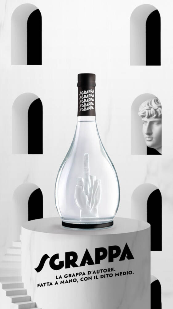 Sgrappa è la grappa rivoluzionaria nata con la volontà di proporre in modo radicalmente diverso, originale e contemporaneo uno dei distillati più rappresentativi del Made in Italy. Il suo carattere dirompente – dichiarato in prima battuta dal design provocatorio della bottiglia e dall’ironico gesto artistico a firma di Maurizio Cattelan presente all’interno – invita a scoprire un modo inatteso e attuale di gustare la grappa, acquavite con una storia ultracentenaria che viene considerata lo “spirito” italiano per eccellenza e sinonimo nel mondo del buon vivere. Sgrappa, infatti, è una grappa moderna che, prodotta artigianalmente in Piemonte, può essere assaporata liscia, ma che raggiunge la sua massima espressione miscelata, grazie a un gusto pulito e leggero, dove ricordi di frutta e fiori bianchi si alternano a un finale schietto, lasciando emergere delicatamente la materia prima: le bucce dell’uva.
