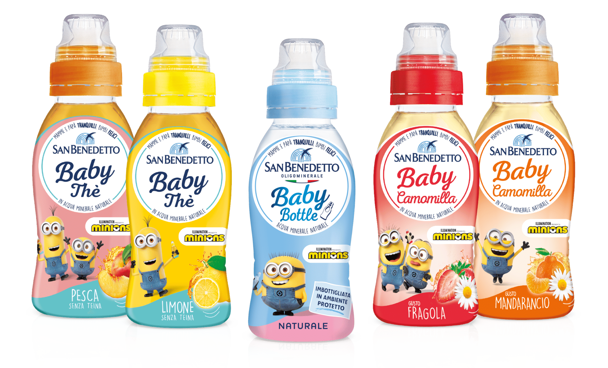 La gamma San Benedetto Baby, animata dalle immagini degli imprevedibili Minions, comprende tre linee di prodotto accomunate da un formato ideale per i più piccoli, senza coloranti e glutine. Il packaging della linea è stato studiato per trasmettere a genitori e bambini sicurezza, serenità e praticità. Con le bottigliette squeezable e il tappo Pull&Push i più piccoli possono idratarsi in ogni momento della giornata divertendosi.