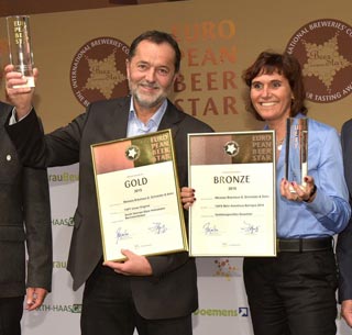 (Nella foto in cima, il mastro birraio Hans-Peter Drexler e la direttrice delle vendite Susanne Hecht durante la cerimonia di premiazione dell’European Beer Awards 2015)