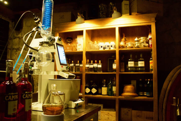 L’Archivio Storico, ristorante e premium bar ubicato a Napoli, è ormai riconosciuto come un contenitore di idee, concetti e innovazioni, sia per l’ambiente intellettuale napoletano che per quello dei professionisti dell’hospitality. Il proprietario della struttura, Luca Iannuzzi, ha creato uno spazio all’interno del locale quasi “fantascientifico” per un cocktail bar e un ristorante gourmet: una sorta di “laboratorio di chimica” ove viene effettuata la “ridistillazione fatta in casa”.