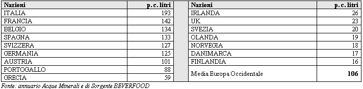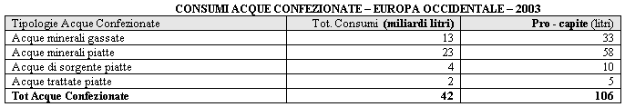 Secondo le valutazioni di Canadean e dell’Associazione Europea dei Produttori (EFBW), i consumi di acqua confezionata nei paesi dell’Europa Occidentale, sono stimabili complessivamente per il 2003 intorno ai 42 miliardi di litri, con dei consumi pro-capite di 106 litri annui . Il continente europeo è ricco di fonti naturali (dove l’acqua sgorga pura alla sorgente) e, quindi, la quasi totalità dei consumi di acqua imbottigliata è soddisfatta da acque naturali (minerali e di sorgente), mentre nel resto del mondo tendono a prevalere le acque trattate (purificate ed eventualmente affinate).