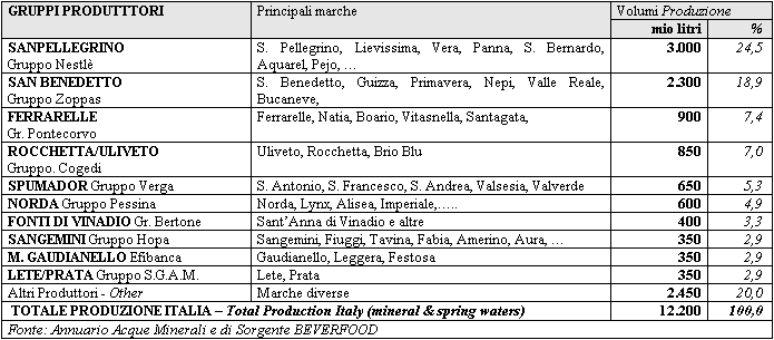 Il grado di concentrazione del mercato è discreto ma meno accentuato rispetto al mercato delle bibite. Secondo le valutazioni Beverfood i primi 4 gruppi produttivi (Nestlè/Sanpellegrino, San Benedetto, Congedi/Uliveto/Rocchetta e Ferrarelle) assorbono circa il 58% del totale mercato a quantità. I primi 10 gruppi (i quattro precedenti, più Spumador, Norda, Sant’Anna, Sangemini, Lete/Prata e Gaudianello) rappresentano circa l’80% del totale mercato. I produttori leaders stentano a mantenere le loro quote, incalzate da un nutrito gruppo di medie aziende molto combattive, che dopo aver conquistato posizioni di leadership a livello regionale, stanno tentando di pervenire ad una distribuzione nazionale.