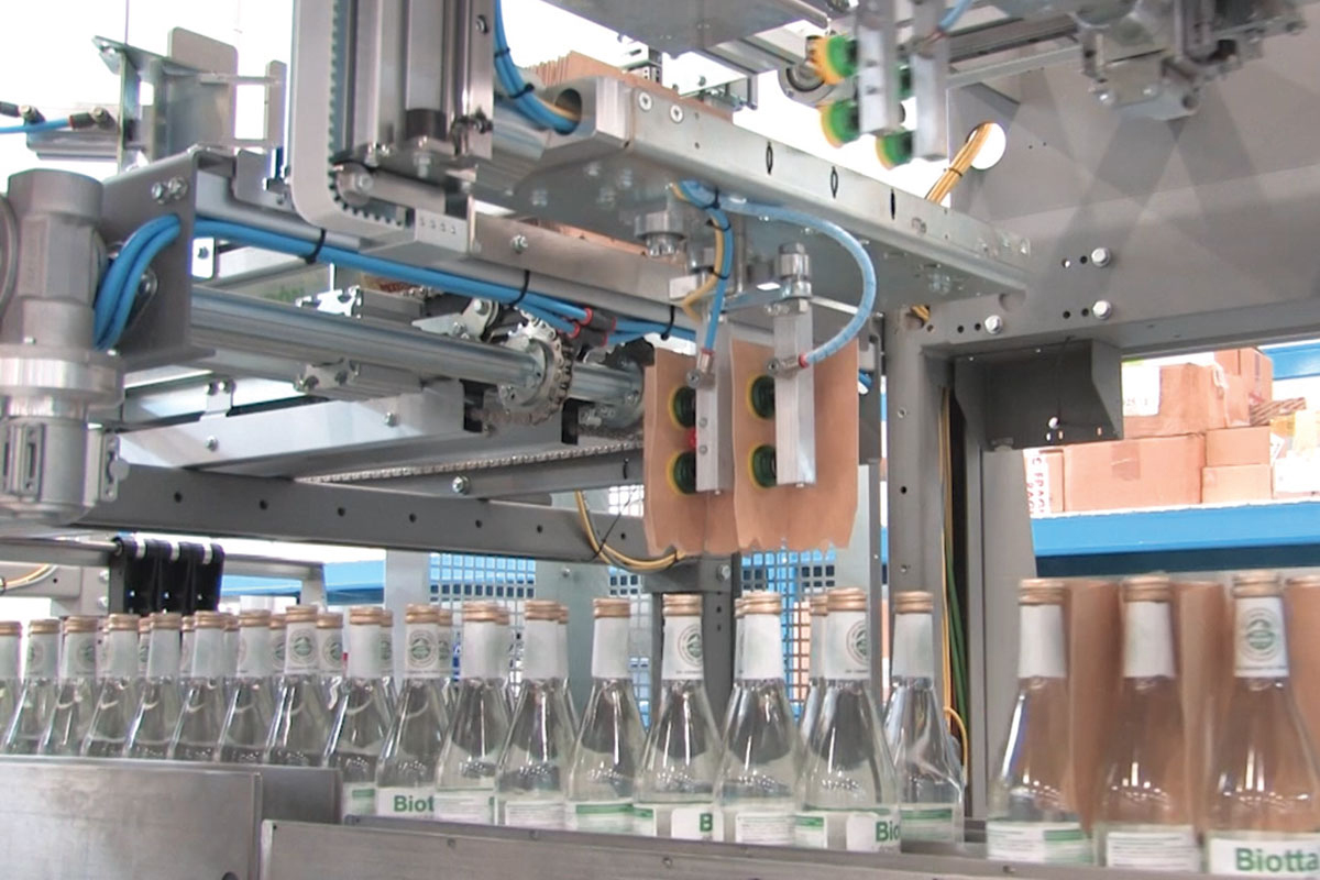 - Un braccio meccanico provvisto di ventose con aspirazione a vuoto preleva dal magazzino un separatore premontato, lo apre e lo deposita tra i contenitori sottostanti, prima che questi siano raggruppati nella configurazione di pacco desiderata