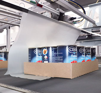The solutions showcased at Anuga FoodTec pack metal containers of tomato soup in 4×3 format in tray+100 % recycled film, that are then palletized by the new “mini-pal” at the speed of 15 packs/minute.