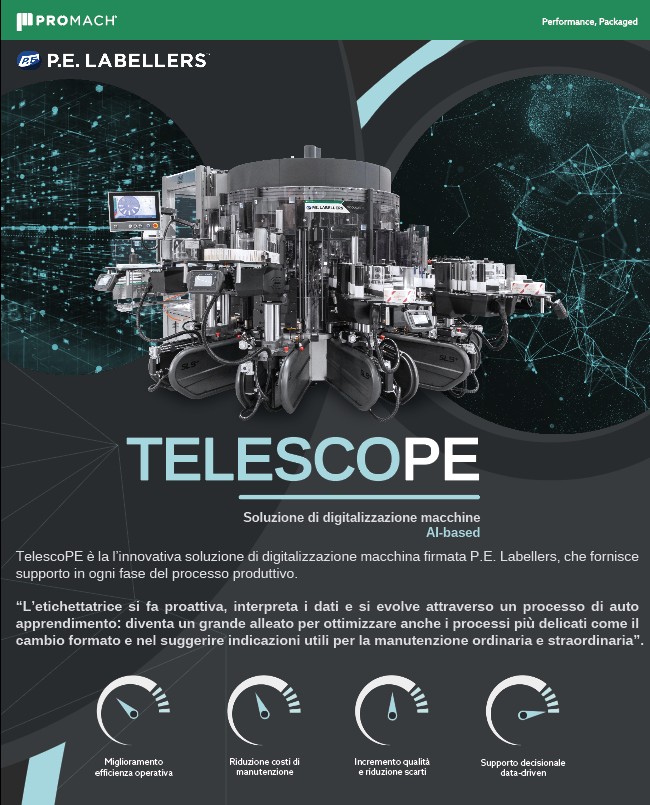 L’intelligenza artificiale a bordo macchina ne facilita grandemente l’uso: l’etichettatrice diventa un vero proprio partner, tanto per l’operatore che la utilizza quanto per l’azienda che si trova a disposizione in modo facile ed intuitivo tanti dati che prima erano difficili da aggregare. La soluzione TelescoPE offre infatti suggerimenti per ottimizzare vari processi, anche i più delicati come il cambio formato, indicando all’operatore come gestire e migliorare i passaggi da un formato all’altro. Grazie all’AI, attraverso un processo di auto apprendimento, la macchina etichettatrice riesce anche a dare suggerimenti utiliper la manutenzione ordinaria e straordinaria: riduce la necessità di interventi tecnici esterni, indica le attività necessarie in modo semplice, analizza tutte le criticità in modo – finalmente – proattivo.