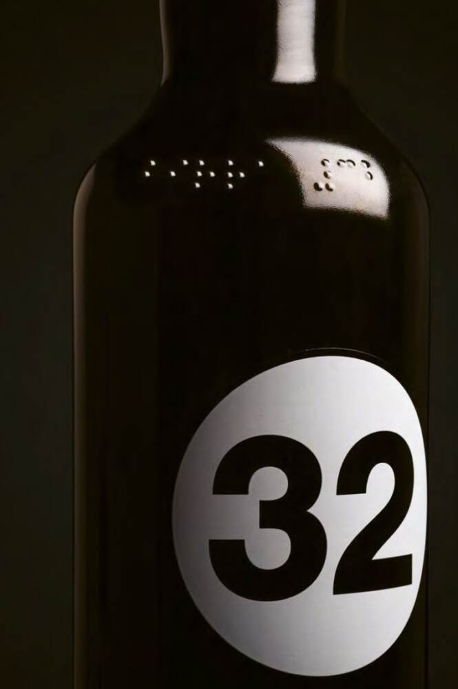 Sulle bottiglie di vetro, la scritta Birra 32 è impressa in alfabeto Braille rendendole accessibili e riconoscibili a tutti grazie al solo tatto.