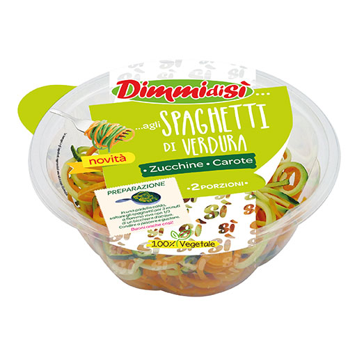 La nuova gamma DimmidiSì è composta da due proposte di prodotto, deliziose anche gustate a crudo. DimmidiSì… agli Spaghetti di Verdura – nelle referenze Zucchine e Carote e Barbabietola e Carote – sono ideali per i consumatori che conoscono gli spaghetti di verdura come alternativa alla pasta di grano; DimmidiSì… alla Spaghettata di Verdure propone, invece, una ricetta completa in due varianti, perfetta per un target disponibile a testare le novità alimentari che gradisce al contempo la facilità di preparazione dei piatti. Le ricette della spaghettata sono una classica Spaghetti di Zucchine e Carote con mozzarelline e pomodorini semisecchi e una più trendy Spaghetti di Barbabietola e Carote con feta e soia edamame.