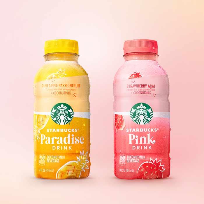 Starbucks® Pink Drink presenta audaci aromi di frutta di fragola e açaí combinati con latte di cocco e succo di frutta rinfrescante e Starbucks® Paradise Drink è caratterizzato da aromi di frutta tropicale quali ananas e frutto della passione, miscelati con latte di cocco e succo di frutta rinfrescante. Le nuove bevande RTD colorate e rinfrescanti inizieranno a essere distribuiti questo mese nei negozi di alimentari, rivenditori nazionali, minimarket e stazioni di servizio, nonché online dove vengono venduti generi alimentari. Le bevande saranno disponibili a un prezzo al dettaglio suggerito di $ 3,67 per bottiglia da 14 once (i prezzi variano a seconda del rivenditore).