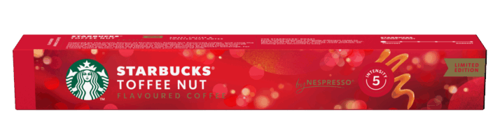 Starbucks® Toffee Nut by Nespresso® è un’esclusiva bevanda aromatizzata che ti conquisterà al primo sorso: realizzata con caffè 100% Arabica, con gli stessi chicchi utilizzati nelle caffetterie Starbucks® (intensità 5 su 12, tostatura chiara), offre un’esperienza unica grazie all’aroma di caramello e nocciole tostate, che si abbina perfettamente all’atmosfera allegra e scintillante delle festività.