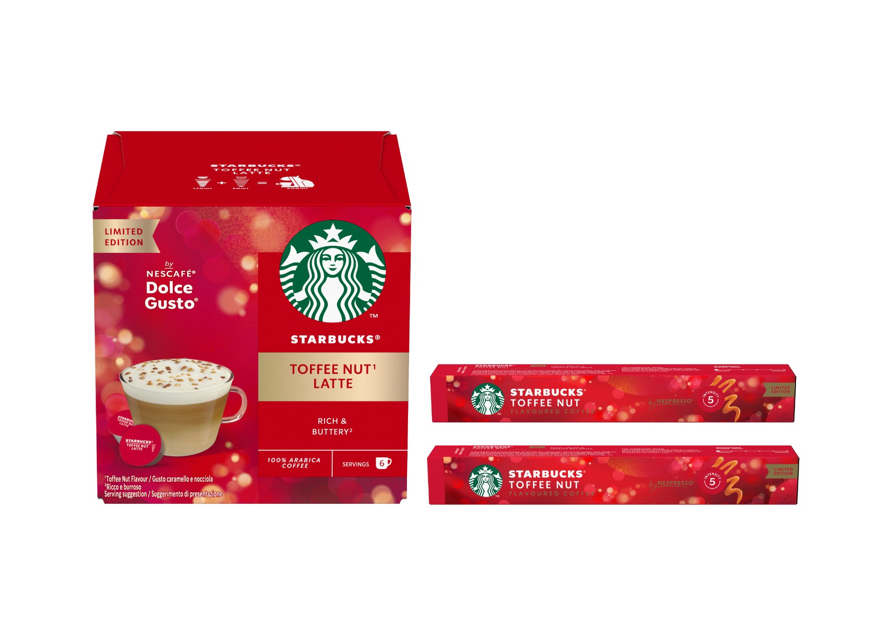 Per celebrare con ancora più gusto, quest’anno Starbucks® porta nelle case italiane le sue edizioni limitate natalizie: Starbucks® Toffee Nut by Nespresso® e Starbucks® Toffee Nut Latte by Nescafé® Dolce Gusto®. Avvolgenti, golose e perfette per scaldare il cuore nei momenti in cui l’unica cosa che conta è stare insieme.