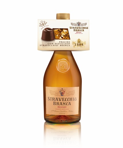 Il pack contiene una bottiglia di Stravecchio Branca accompagnata da due praline Dulcioliva (36 g), ciascuna con un guscio finissimo di cioccolato e un cuore cremoso che racchiude l’inconfondibile aroma di Stravecchio.