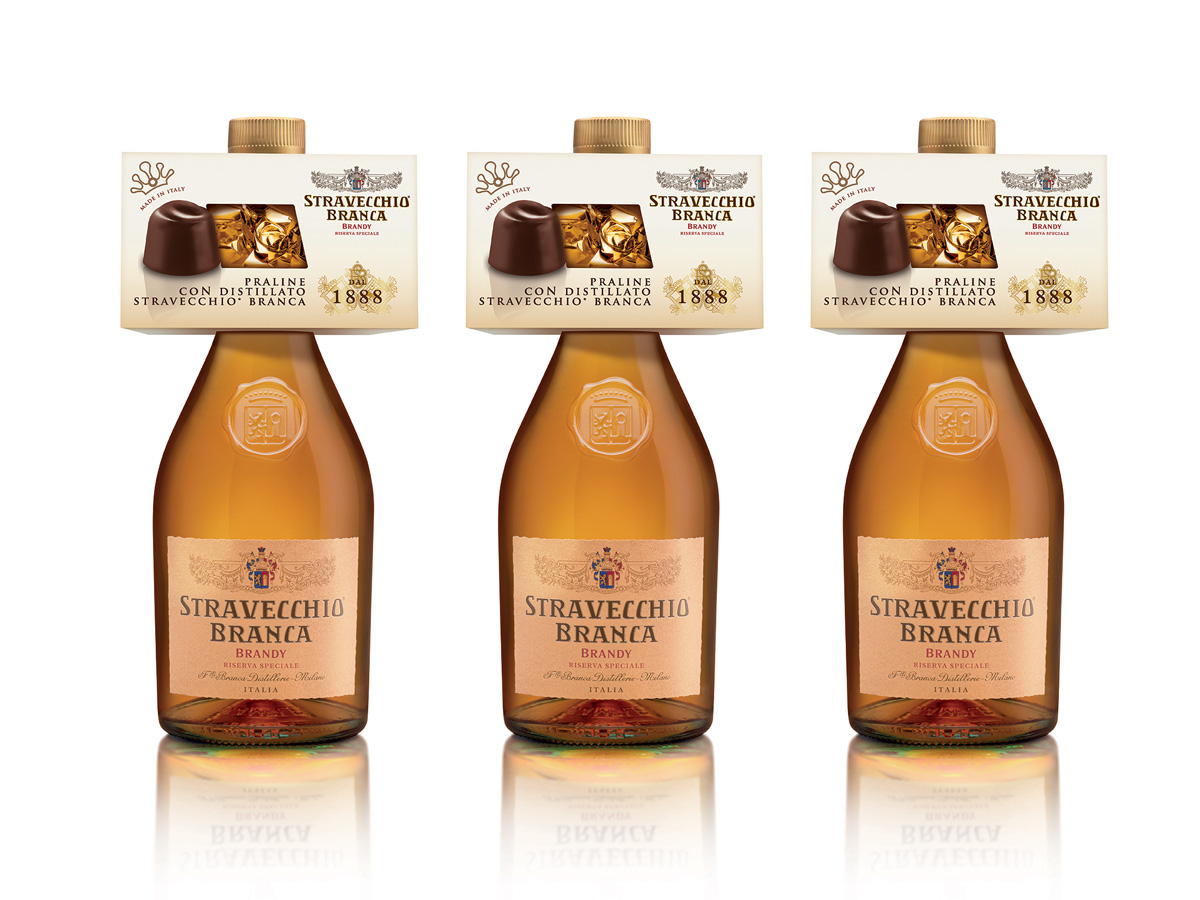 Il pack contiene una bottiglia di Stravecchio Branca accompagnata da due praline Dulcioliva (36 g), ciascuna con un guscio finissimo di cioccolato e un cuore cremoso che racchiude l’inconfondibile aroma di Stravecchio.