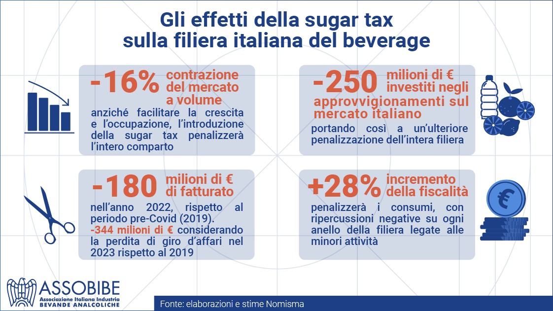 Lo studio di Nomisma dimostra gli effetti devastanti, economici e sociali, dell’introduzione di un’imposta del valore di 10 euro/ettolitro in un momento già così incertospiega Giangiacomo Pierini, Presidente ASSOBIBE -. Anziché facilitare crescita e occupazione, con l’introduzione della Sugar Tax nel 2022 si avrà una contrazione del 16% del mercato a volume, -180 milioni di euro di fatturato rispetto al 2019 e -344 milioni di euro se consideriamo la perdita di giro d’affari nel 2023 rispetto al 2019. Inoltre, togliere liquidità alle imprese con una nuova gabella da versare a fine mese si traduce in maggiori difficoltà e minori investimenti. Un trend nefasto che affosserà la ripresa e il ritorno ai consumi pre-Covid previsti a fine biennio 2022-2023”.