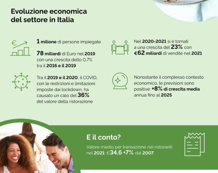 Dallo studio emerge che l’industria della ristorazione rivolta al pubblico è una delle più grandi componenti dell’economia in Europa, con un valore di oltre 326 miliardi di euro nel 2019 e una crescita del 3% nel periodo 2016-2019. La valutazione è la stessa per l’Italia, dove nel 2019 la ristorazione ha generato 78 miliardi di euro, con una crescita dello 0,7% tra il 2016 e il 2019. Nel 2019-20 il Covid, con le restrizioni e limitazioni imposte dai lockdown, ha causato un calo del 38% del valore della ristorazione in Europa e del 36% in Italia.