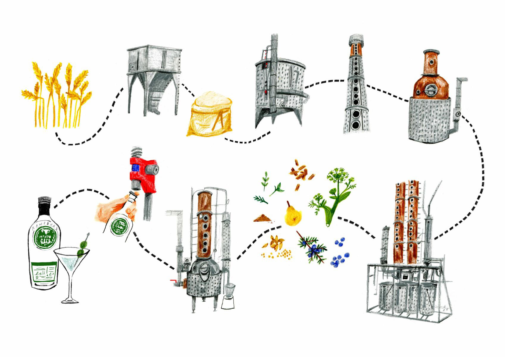 Il grano della pregiata varietà Horatio viene impiegato nella produzione dell’alcol e in etichetta viene indicato in quale campo è cresciuto, quando è stato seminato e quando è stato raccolto. Al processo che realizza l’alcol puro da grano Horatio, si aggiungono altre fasi produttive che vedono innanzitutto 9 componenti botaniche: ginepro, mela cotogna, coriandolo, angelica, radice di Iris, liquirizia, limone, arancia e cannella. Le botaniche sono distillate insieme con alambicco tradizionale per gin in rame da 140 litri (small batch). Il distillato viene riscaldato, condensato, portandolo all’86% vol. alcolico, diluito con acqua del fiume Kennet filtrata con il gesso, filtrato e imbottigliato a mano.